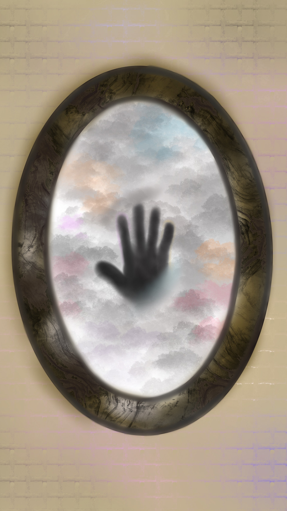 Then the hand was approaching the mirror, it stays there touching the glass surface,